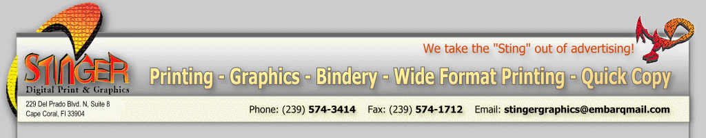 Stinger Digital Print & Graphics prides itself on personal attention and state of the art equipment. We guarantee quality finished products, the best customer service, fair pricing and quick turn around.